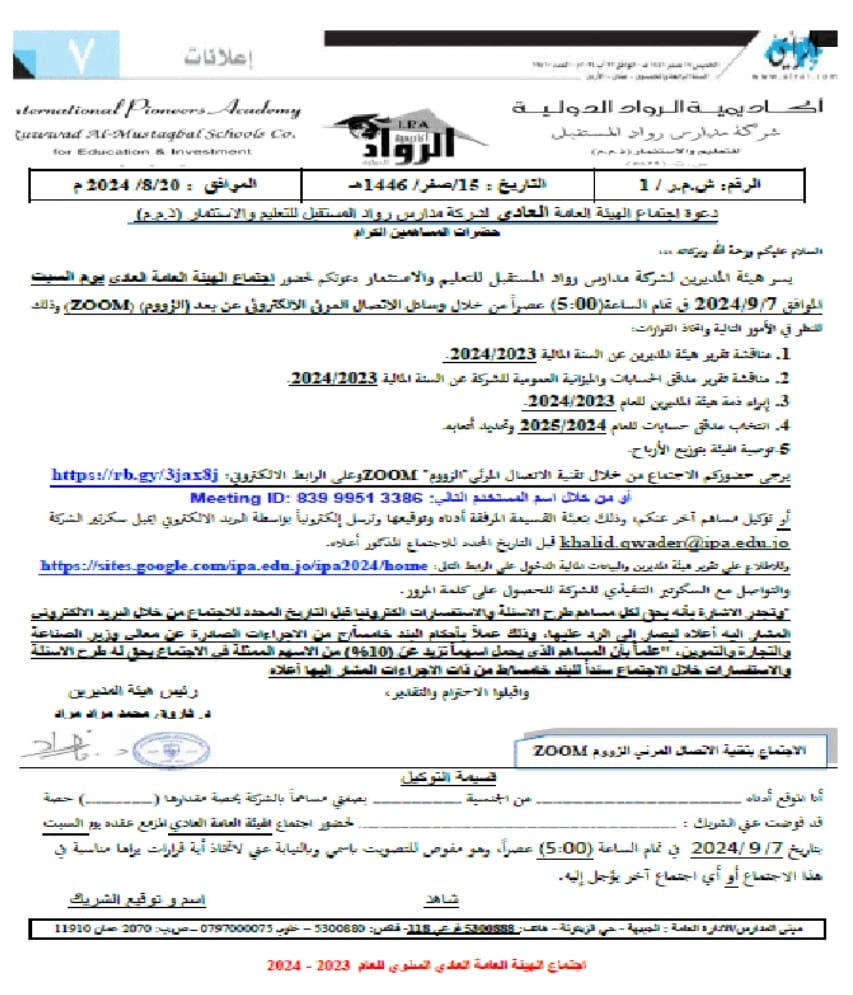 You are cordially invited to attend the Ordinary General Assembly Meeting of Rawad Future Education and Investment Company on Saturday, September 7, 2024, at 5:00 PM via Zoom.